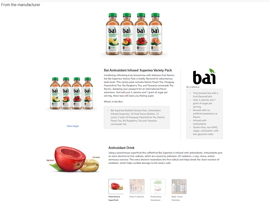 Though Premium A+ is a good choice for some products, it may not be the best option for everyone. Up-and-coming beverage company Bai has created strong product pages using standard A+ modules and then focused on driving impressions and creating brand awareness with closely monitored Amazon Marketing Services (AMS) campaigns.