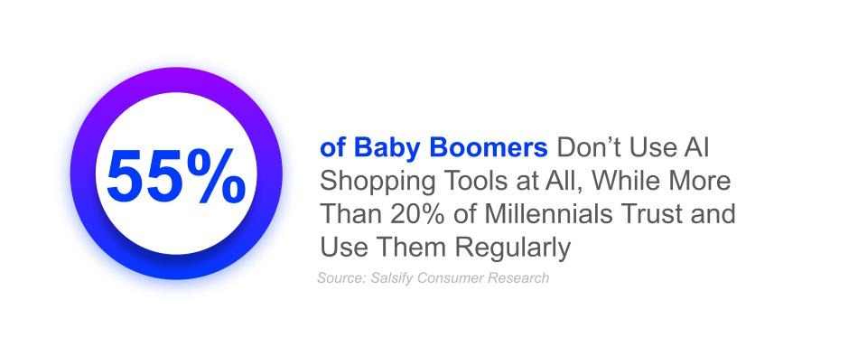 Salsify’s “2026 Consumer Research” report reinforces these AI mindsets: More than 20% of millennials say they “trust and use AI shopping tools regularly, while 55% of baby boomers don’t use them at all.” Gen Z and Gen X align more closely with millennials, but each generation has its own approach.