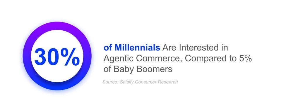Agentic commerce, or the use of AI agents as personal shoppers, is the perfect example of the generational AI divide. Thirty percent of millennials are interested in using agentic commerce, whereas only 5% of boomers feel the same, according to Salsify consumer research.