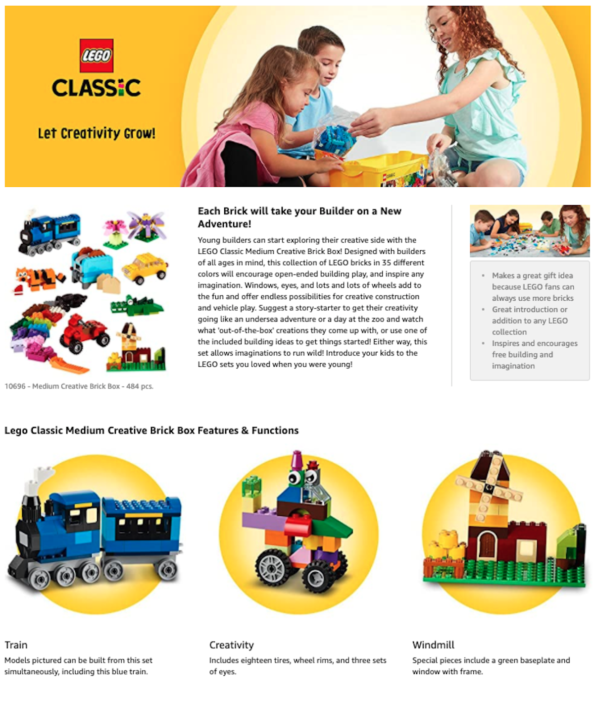 Consider the in-store versus the online experience of buying a LEGO Classic set: An brick-and-mortar shopper can pick up the set in-store and view the colorful images on the packaging to learn about the product. An online shopper, however, can watch a video of children unboxing the set and building it — and can compare this set to five other LEGO sets to find the option that best fits her needs.