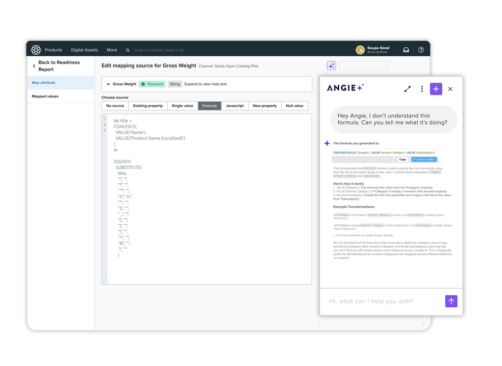 Angie has deep knowledge of the Salsify platform and formula language, and uses that knowledge to provide recommendations back to users. Angie uses AI as the reasoning engine to figure out what properties and Salsify formulas can be put together to fulfill the requirement of a given field in a channel.